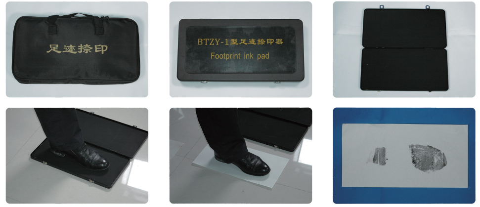 用于提取案件相关人员的鞋印样本。在铁盒内有两块1000pxx500px的储墨垫,储墨垫中储存着适量的油墨,铁盒两面是缓冲橡胶垫