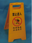 在“人”字型塑料牌上印刷“禁止进入”,“现场勘查正在进行”等字样,警示无关人员不要进入勘察现场。