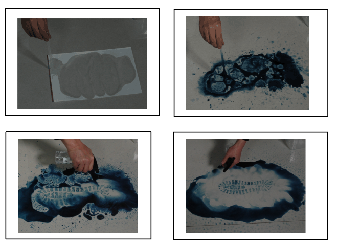 将雾化喷头安装在清洗剂瓶口上,扣动喷头扳机,用清洗剂的气流冲洗脚印上的染色剂,将染色剂驱赶到血脚印的周边,被染成黑色潜血脚印就现露出来