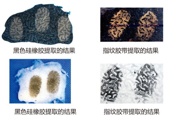 在光盘、皮革等表面比较粗糙的客体上,用指纹粉末显现的指纹,如果用指纹胶带粘取,提取的指纹会出现断线现象。原因是粗糙客体表面上有许多凹陷的地方,胶带不能接触到这些凹陷的地方。硅橡胶是粘稠状物质,将其涂抹在客体表面上,它会渗入到凹陷处,把凹陷处和突起处的指纹粉末都粘附起来。硅橡胶凝固后就变成了有弹性的固体物,把它从客体表面上揭起,就可以看到连贯的指纹纹线