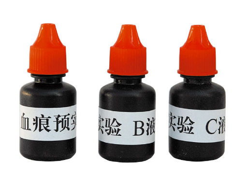 滤纸折出纸角,擦拭被检斑迹后,在擦试部位分别滴加A液1滴和B液1滴,约10秒钟后再加C液1滴,呈天兰色时为阳性反应。